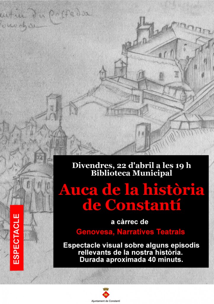 Tornem a fer l’Auca de la Història de Constantí. El proper divendres 22 d’abril de 2016, a les 19 h., a la Biblioteca Municipal de Constantí tornem a representar l’Auca de la Història de Constantí, que tan va agradar la vegada anterior que es va representar. Es tracta d’un espectacle audiovisual que recrea els episodis més rellevants de la història del nostre poble. Una visió amena apta per a tots els públics. Espectacle a càrrec de la companyia Genovesa. Narratives Teatrals. No us ho perdeu perquè passareu una bona estona. I en acabar… un concert amb el grup local InVersion. Tot això per viure la revetlla de Sant Jordi en bona companyia.
